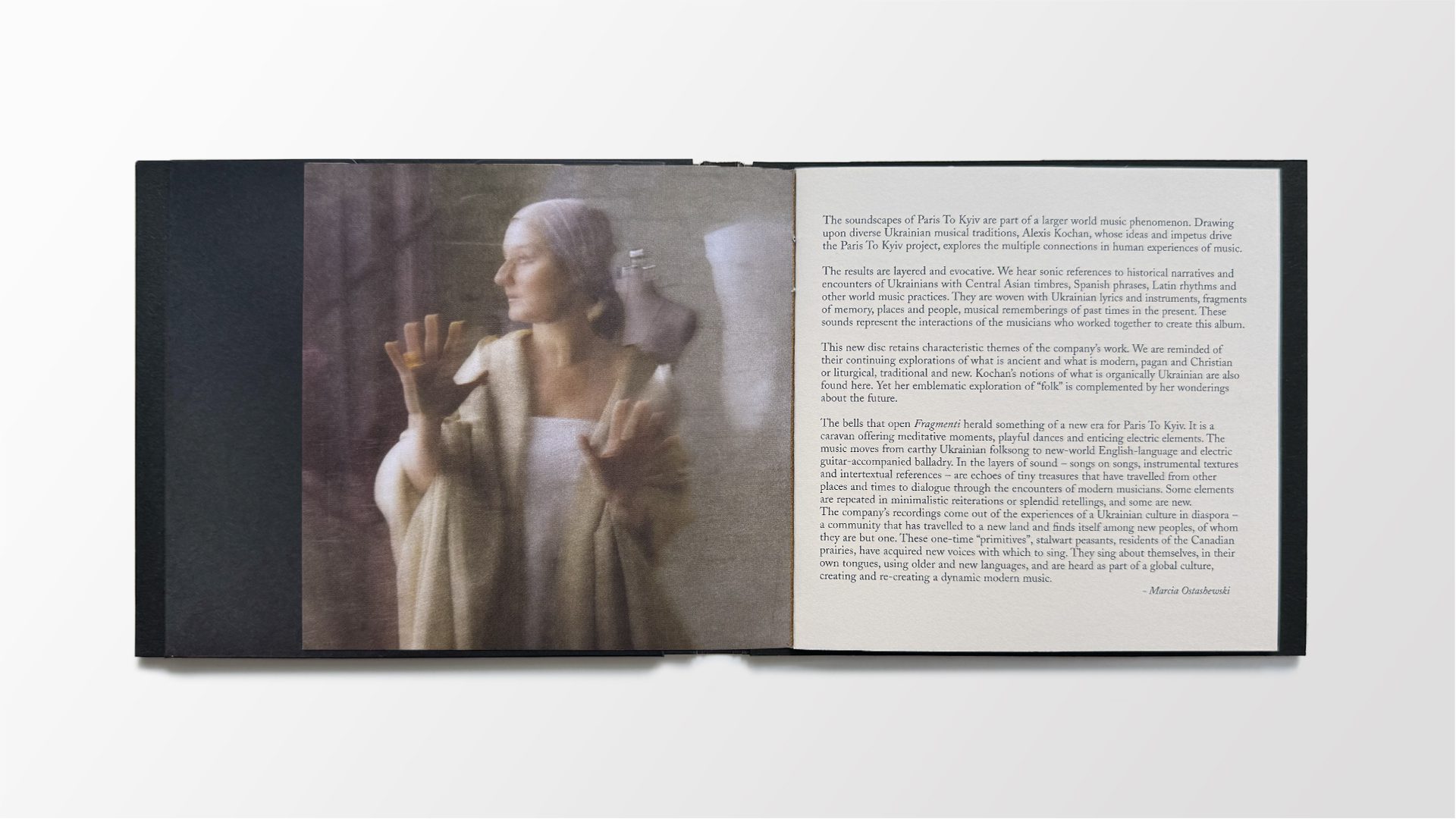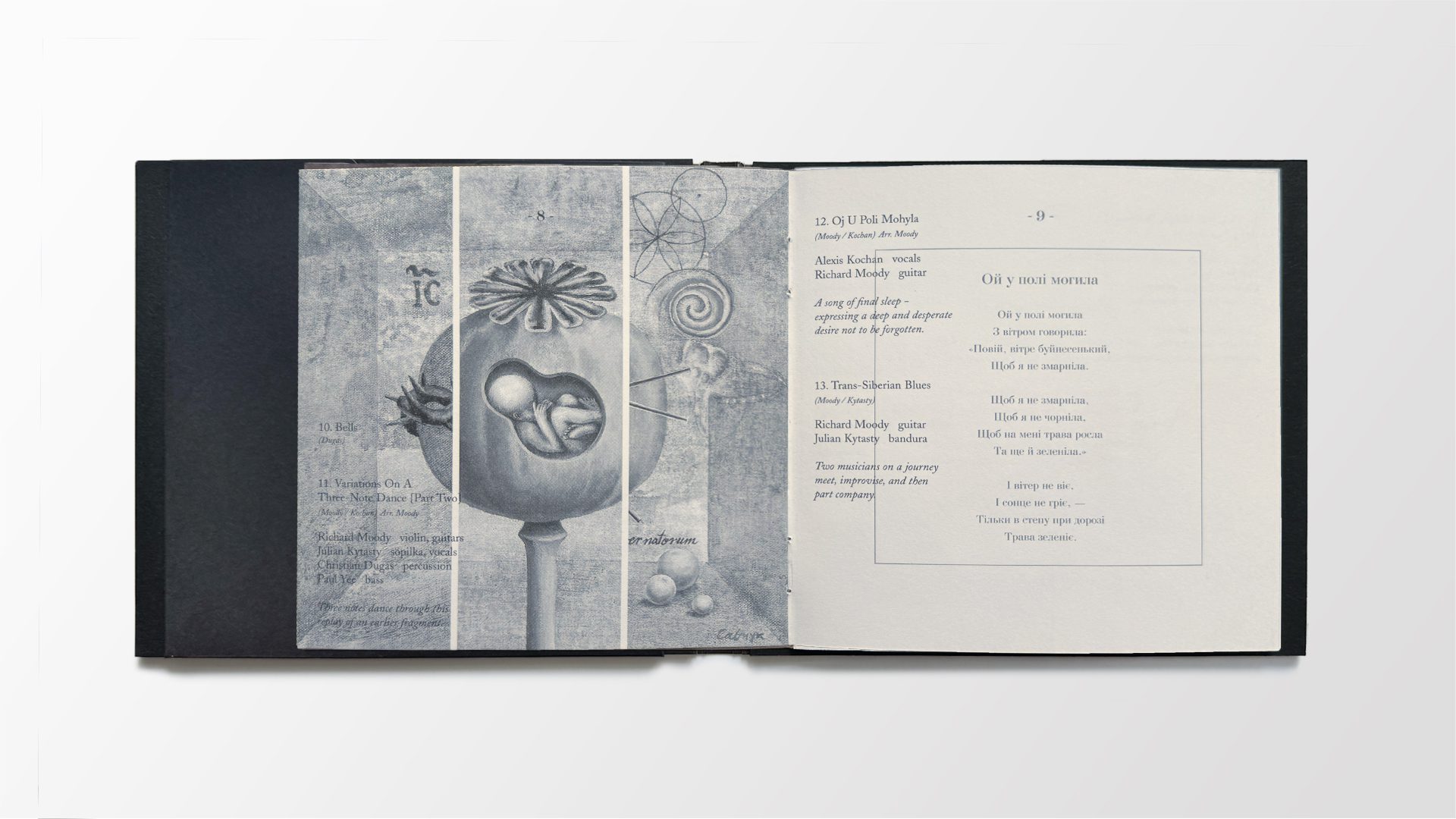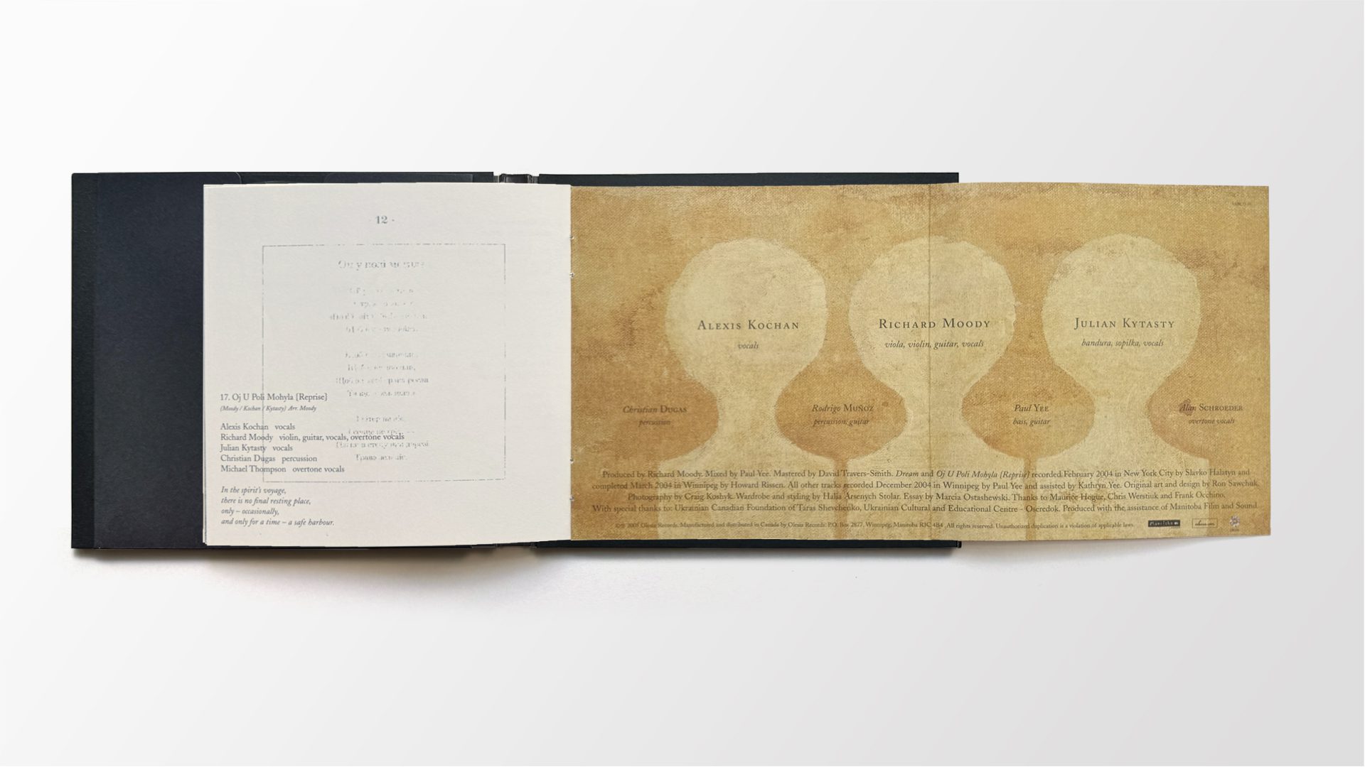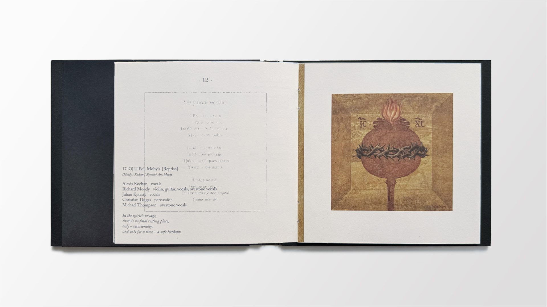 No plastic was used. The CD rests in a custom paper sleeve, held friction-tight. The 12-page booklet pairs Ukrainian lyrics with spare English “essences” rather than direct translations. These fragments mirror the musical approach: poetic, partial, open to interpretation.