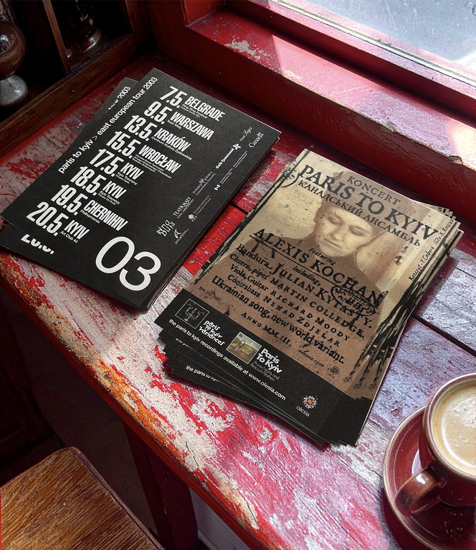 I created a small campaign to support the shows and point audiences to the website. The line Ukrainian song, new world variant became a touchstone. The poster and postcard designs emulated the look and feel of a 17th-century artifact—complete with archaic glyphs, acquisition stamps, and aged textures—like something newly unearthed. A mix of English, Polish, and Ukrainian Cyrillic expressed the ensemble’s multilingual identity in an effortless way—without needing to translate every word. The balance of languages reflected the tone of the music itself.