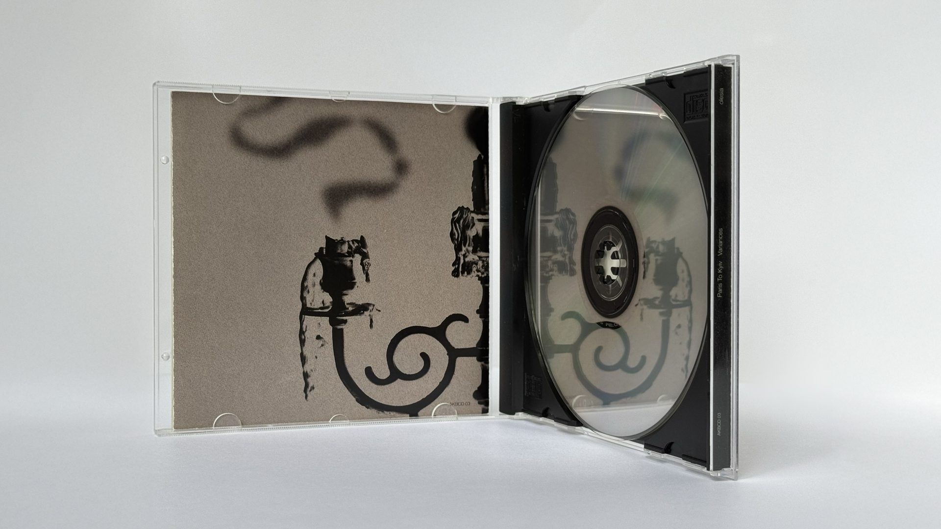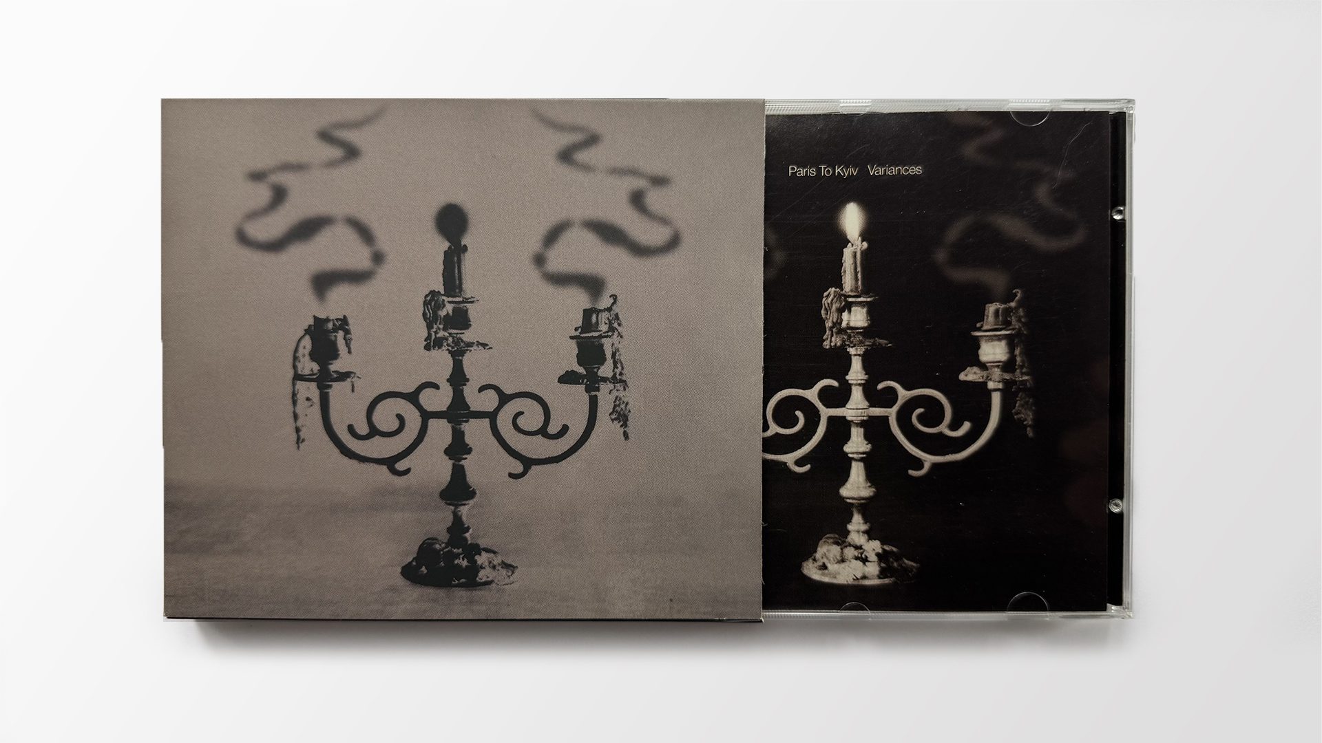 The 1996 first edition of Variances pushed expectations by packaging the jewel case inside a printed slipcase—unusual for its time and carefully considered. The slipcase presented one view of the candelabra: light, tonal, and inverted. The jewel case underneath revealed its darker, photographic twin—high-contrast and positive. The two images—one a visual negative of the other—functioned as deliberate inverses. Together, they mirrored the music’s own dualities and set the tone before a single note was heard.