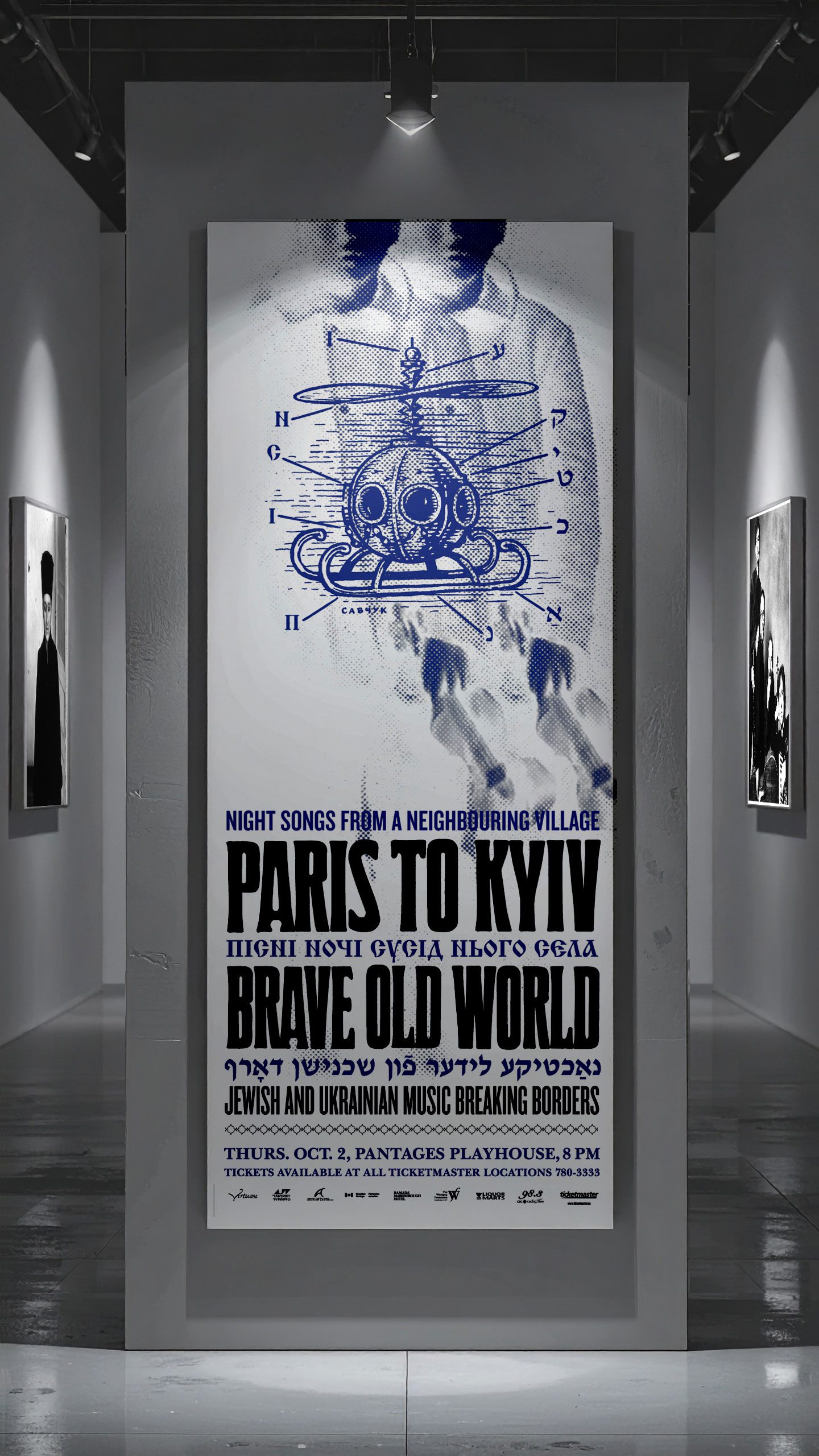 The poster took a similarly imaginative approach. It layered an archival photo of a village fiddler—duplicated and doubled—into two nearly identical figures, bound more by likeness than difference. Superimposed over them: a fantastical flying machine drawn like an old-world blueprint. Its labeled parts—rendered in Cyrillic and Hebrew—spelled out Night Songs, echoing the music’s ability to transcend borders.
