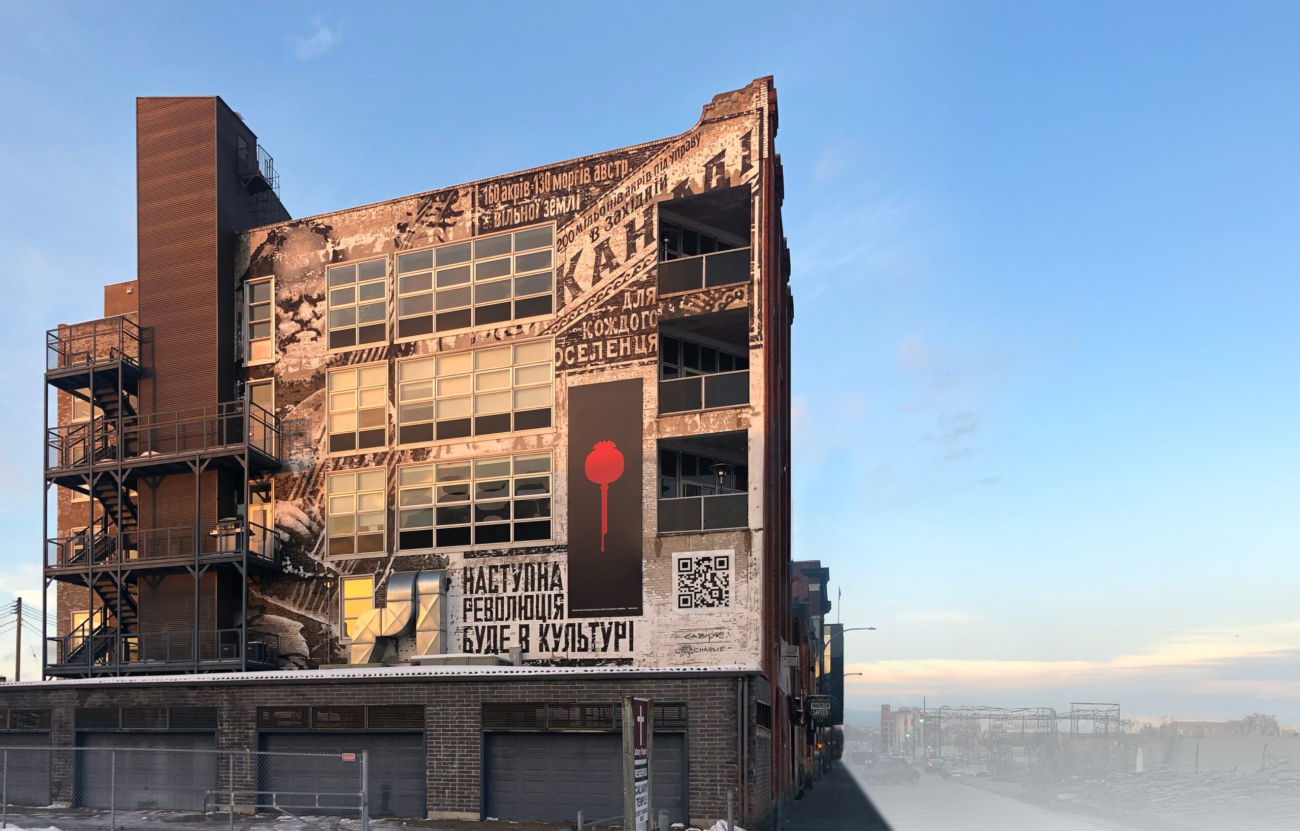 Below all of this, painted in bold Soviet-era type: НАСТУПНА РЕВОЛЮЦІЯ БУДЕ В КУЛЬТУРI An expression underscoring a message of hope for tomorrow, that revolutions need not result in bloodshed but rather can be an outpouring of ideas and creativity.