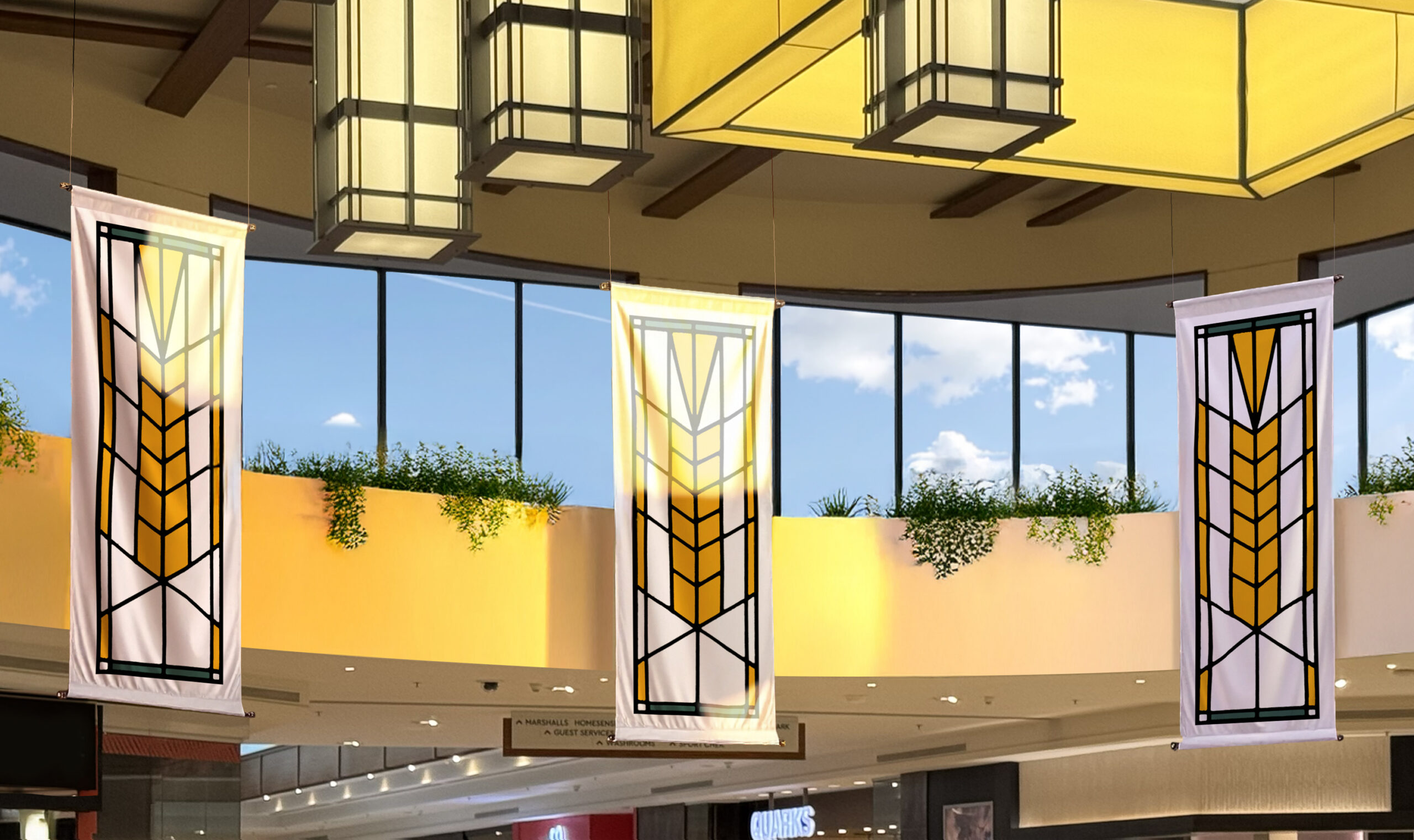 The final work extended beyond the logo. At the architects’ request, I designed large, Prairie Style–inspired fabric banners—abstracted interpretations of a wheat sheaf—that became permanent fixtures in key gathering spaces. I also created a series of illustrated panels outlining the area’s farming history, which were later recognized in Applied Arts Magazine. By drawing from the architectural language of the past, the identity helped ground a major expansion in something timeless—creating a visual bridge between heritage and renewal.